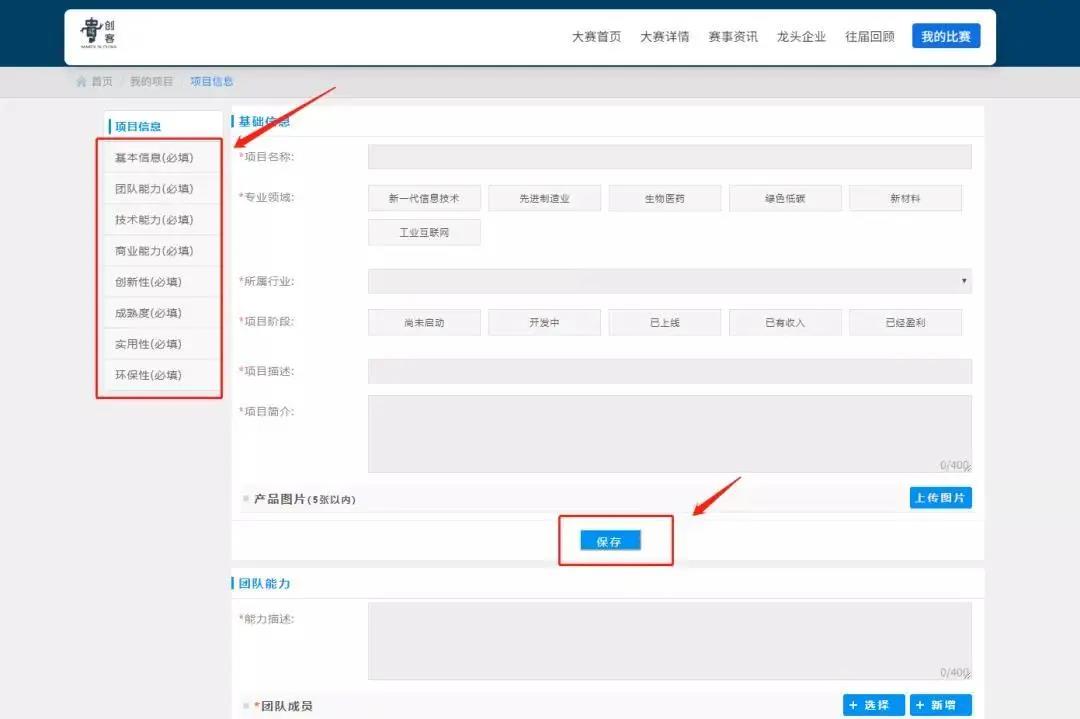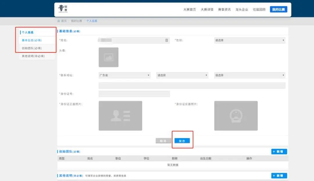 2.进入信息完善界面,填写个人信息,包括“基本信息(必填)”和“创始团队(必填)”,填写完成后点击【保存】。