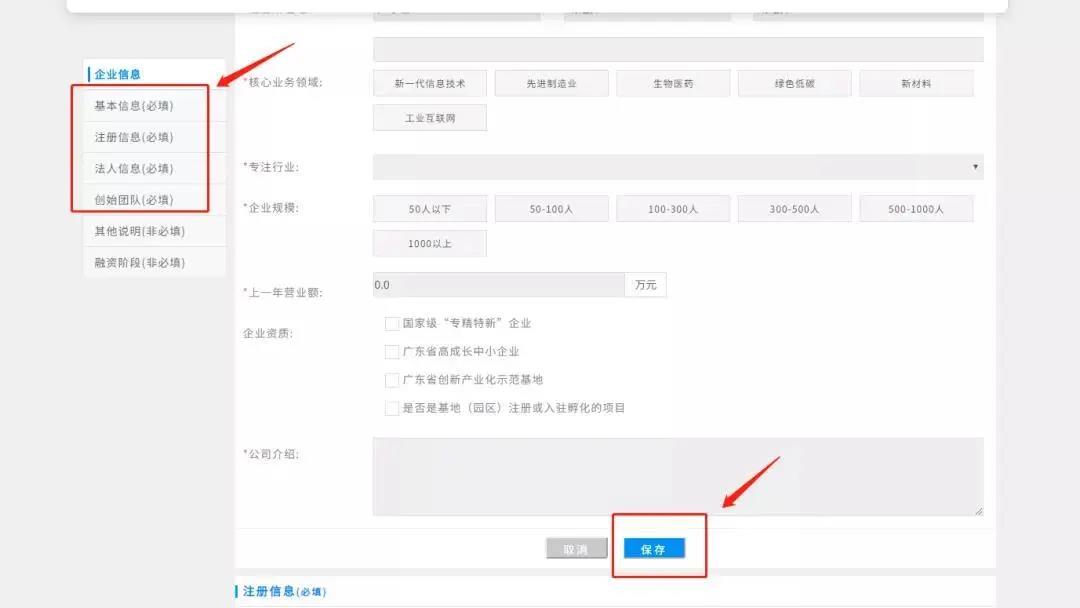 2.点击【新增】,进入信息完善界面,填写企业信息,包括“基本信息(必填)”、“注册信息(必填)”、“法人信息(必填)”和“创始团队(必填)”,填写完成后点击【保存】。