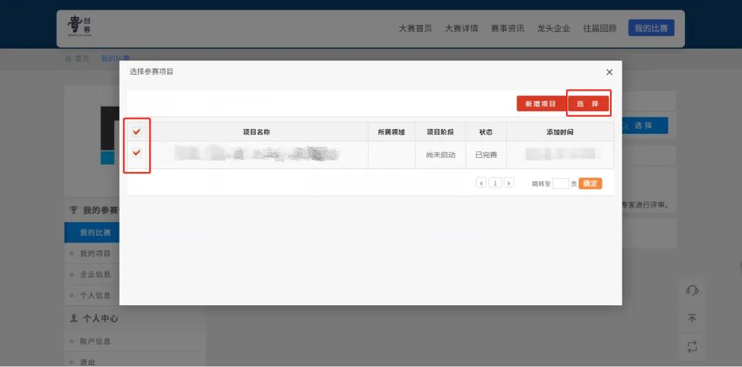 3.在跳转的界面点击“选择”,然后勾选要参赛的项目,再次点击“选择”选定项目。