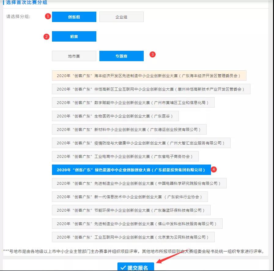 4.选择比赛分组,首先选择“创客组”或“企业组”,然后选择“初赛”,接着选择“专题赛”,再选“2020年“创客广东”绿色能源中小企业创新创业大赛” ,最后点击“提交报名”,即可成功报名。