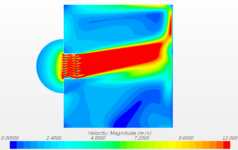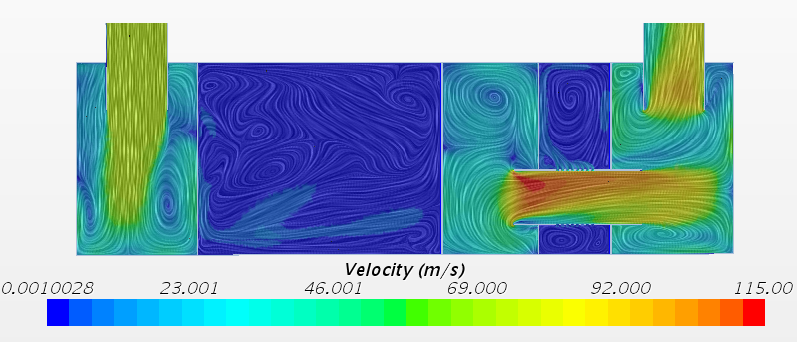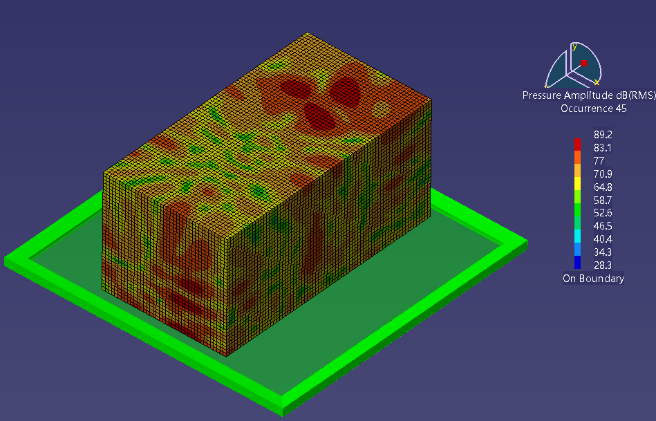 4、 静音发电机组进气设计:采用声学仿真系统LMS Virtual.Lab-Acoustics设计,并经CFD流场计算,保证进风风量满足机组要求且进风风速小于5m/s,有效避免产生过大负压和二次噪声。采用进风百叶窗+消音箱组合方式对进风通道进行吸声处理。其中,消音箱内壁采用微穿孔结构,内设高效吸音材料,降噪性能达40dBA以上。