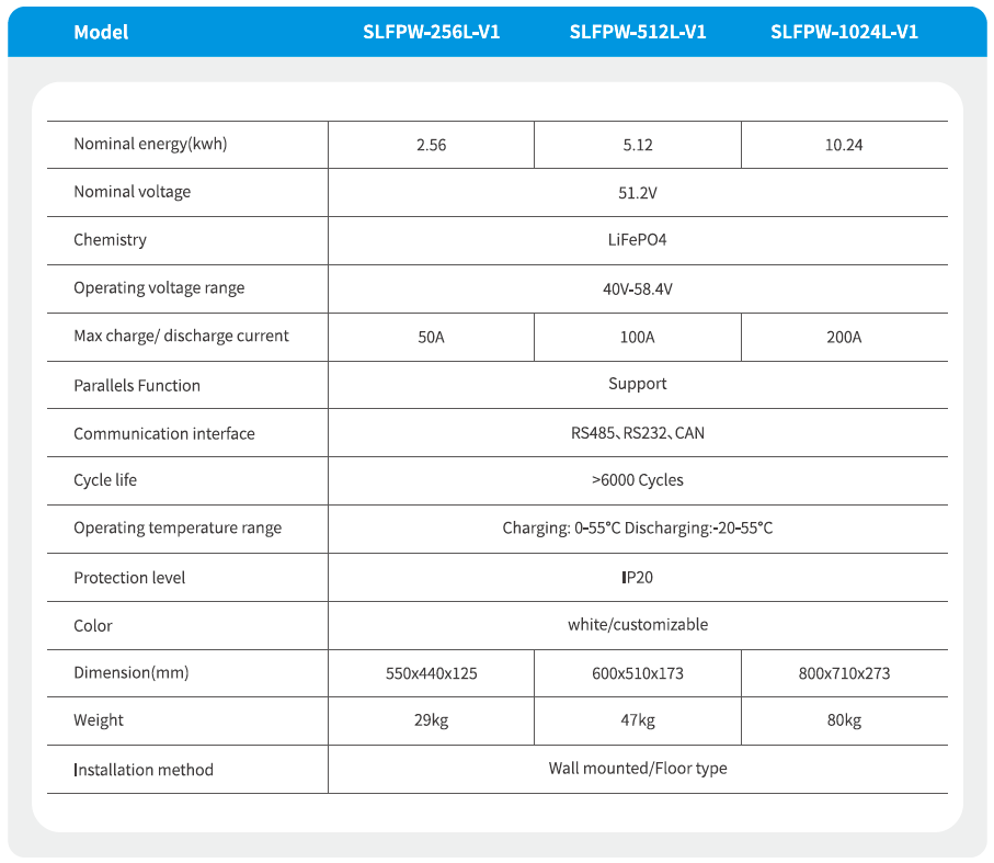 The SLFPW Home Energy Storage System Series offers two installation options, wall-mounted and floor-standing, and battery capacities of 50Ah, 100Ah, and 200Ah to flexibly meet household energy needs. The series features A-grade lithium iron phosphate cells with a cycle life of over 6000 times, built-in BMS for safety protection, and supports RS485/RS232/CAN communication protocols. The system is compatible with various energy storage inverters on the market, catering to a diverse range of user needs.