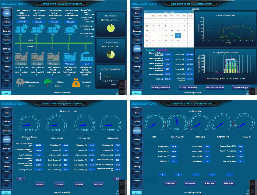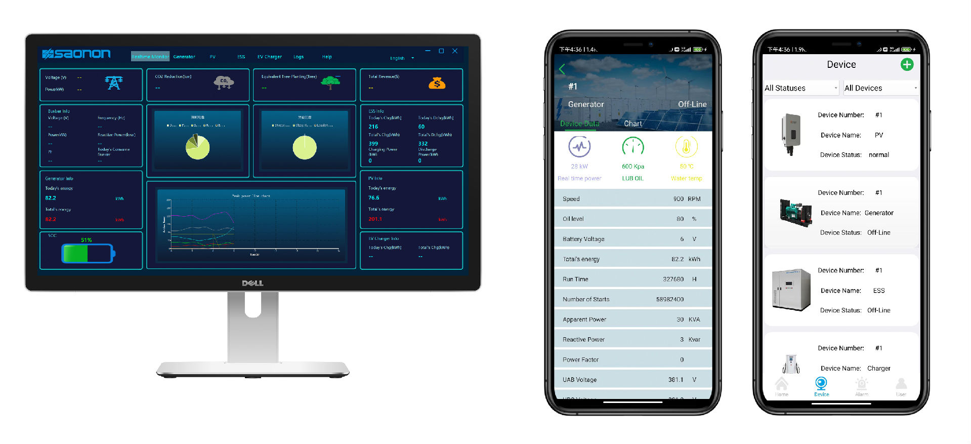 The Comprehensive Management System (CMS) independently developed by SAONON is the information hub and commander of a microgrid that performs comprehensive data management, such as data collection, strategy operation, function control, model analysis and device status, on the various devices of the microgrid. CMS can achieve complementation of multiple energy sources, maximize utilization of renewable energy, lower power generation cost and reduce carbon emission by monitoring and controlling power stations and energy equipment such as solar power, energy storage systems, generator, wind power, charging pile, and auxiliary equipment.